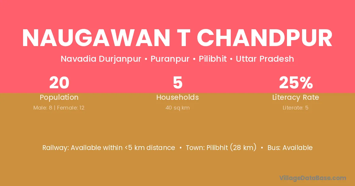 Pilibhit (28 km) is the nearest town to Naugawan T Chandpur village for major economic activities and is located approximately 28 km away.