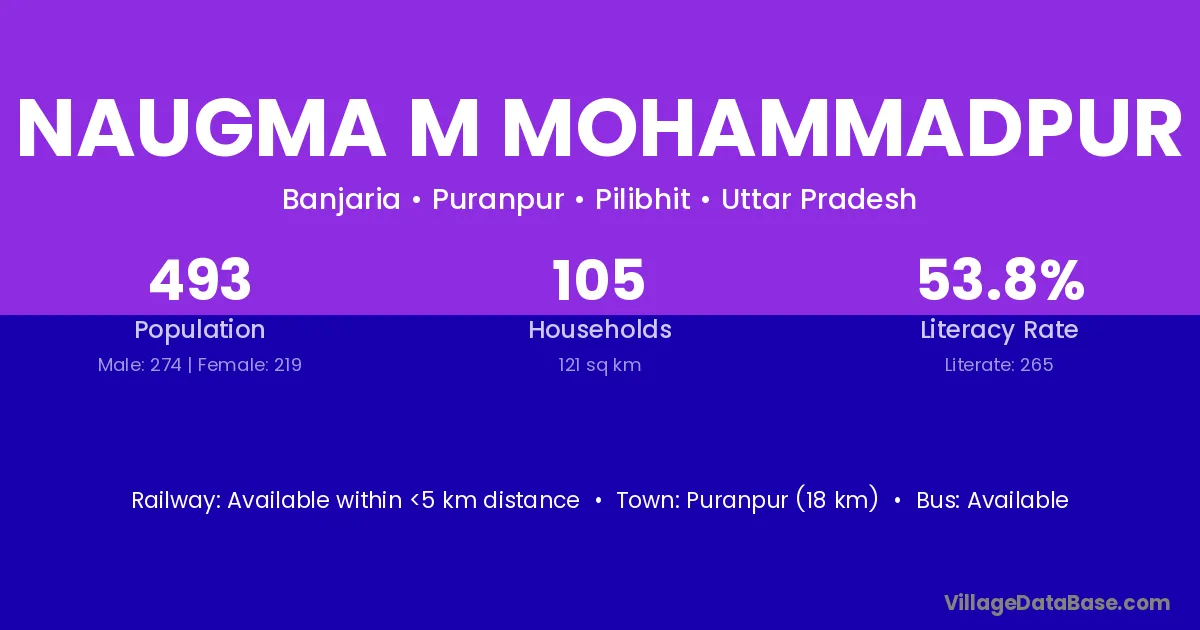 Puranpur (18 km) is the nearest town to Naugma M Mohammadpur village for major economic activities and is located approximately 18 km away.