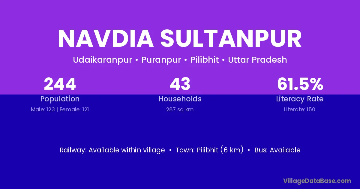 Pilibhit (6 km) is the nearest town to Navdia Sultanpur village for major economic activities and is located approximately 6 km away.