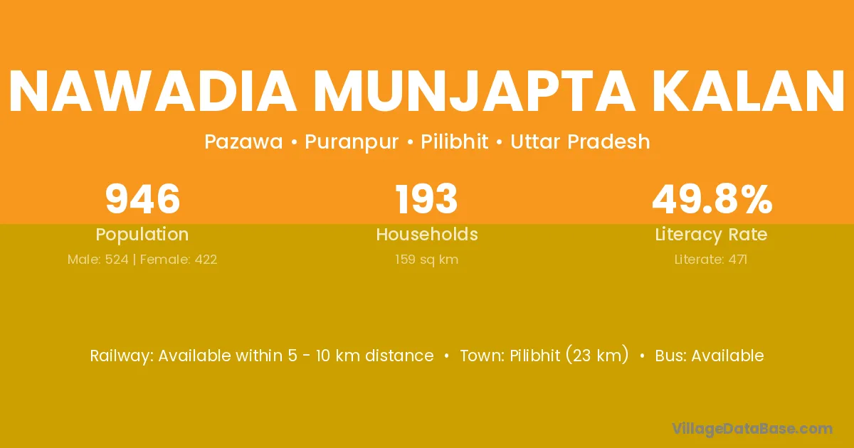 Nawadia Munjapta Kalan village has a total population of 946 people, of which 524 are males and 422 are females.