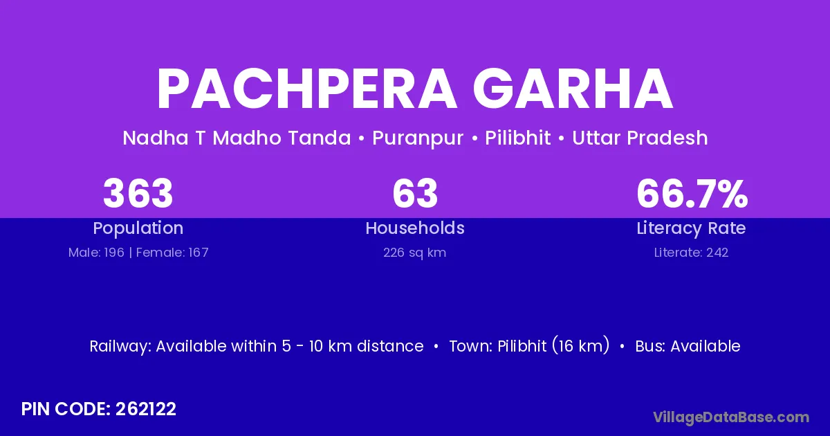 Pilibhit (16 km) is the nearest town to Pachpera Garha village for major economic activities and is located approximately 16 km away.