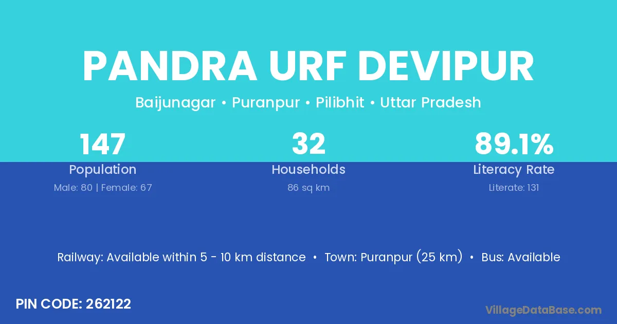 Puranpur (25 km) is the nearest town to Pandra Urf Devipur village for major economic activities and is located approximately 25 km away.