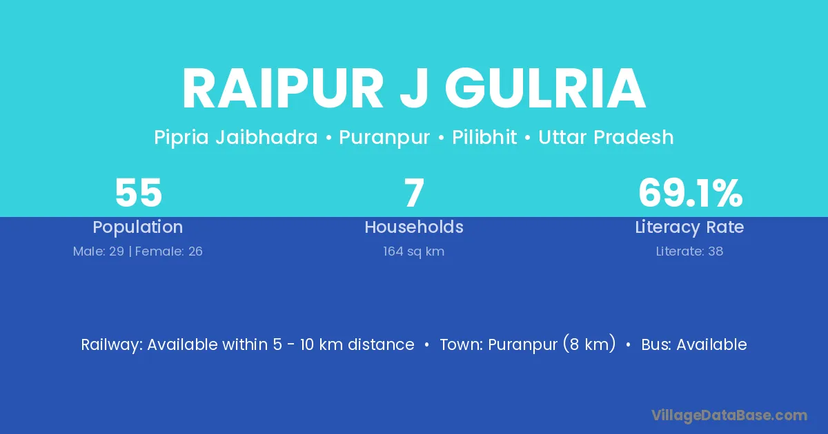 Puranpur (8 km) is the nearest town to Raipur J Gulria village for major economic activities and is located approximately 8 km away.