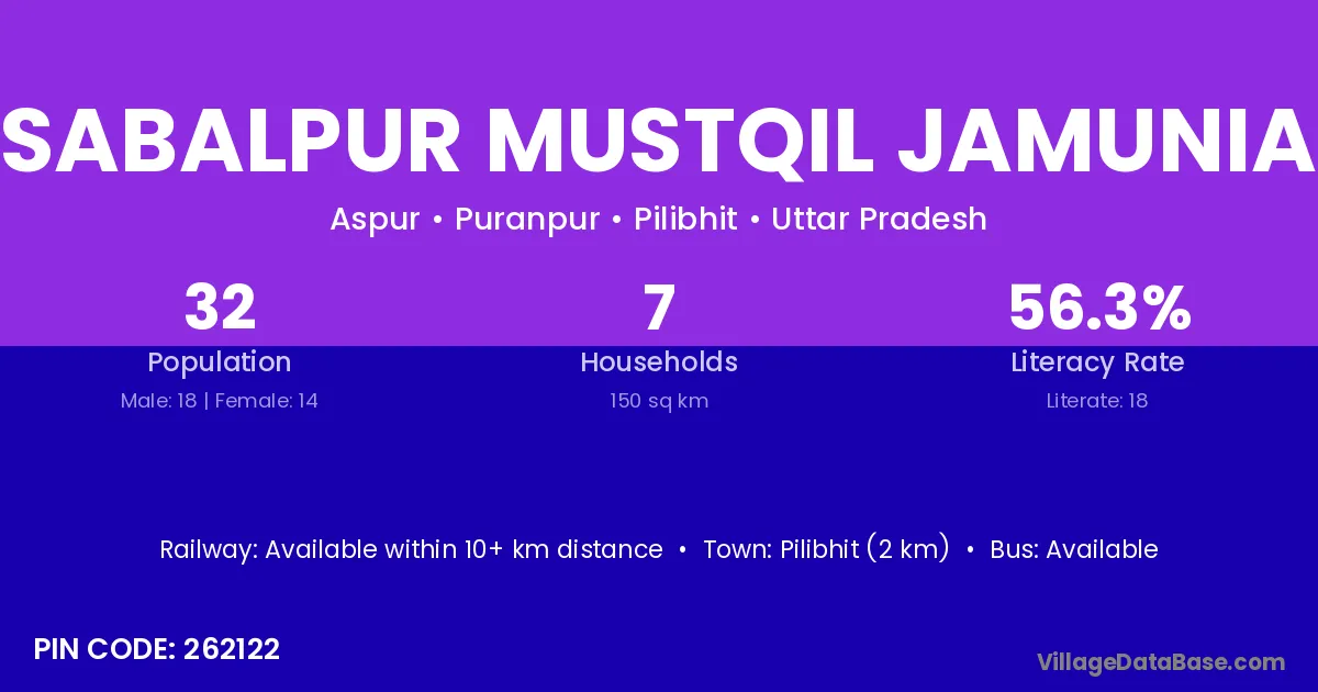 Pilibhit (2 km) is the nearest town to Sabalpur Mustqil Jamunia village for major economic activities and is located approximately 2 km away.