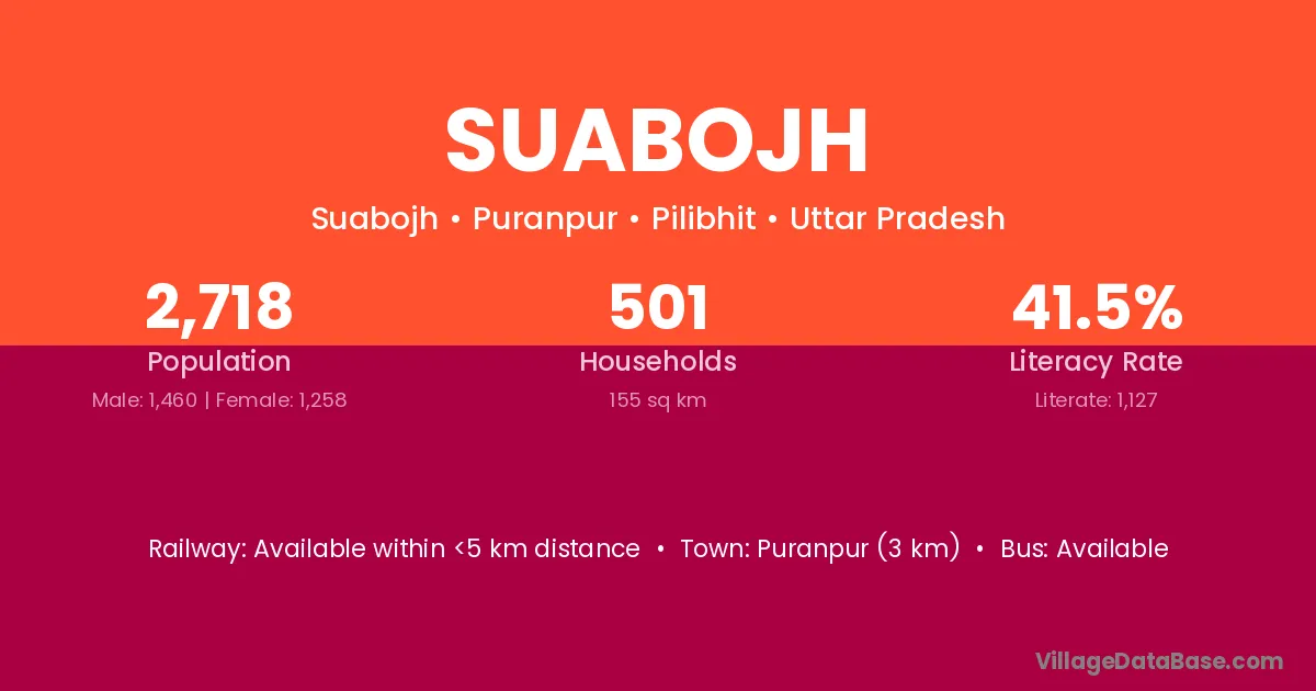 Puranpur (3 km) is the nearest town to Suabojh village for major economic activities and is located approximately 3 km away.