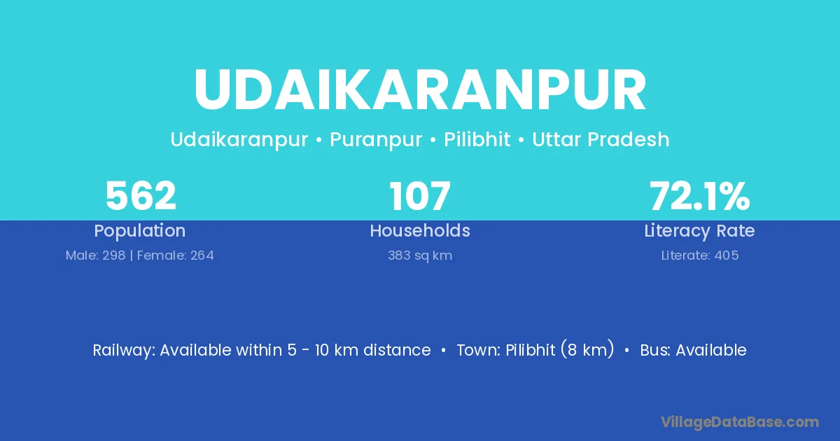 Pilibhit (8 km) is the nearest town to Udaikaranpur village for major economic activities and is located approximately 8 km away.