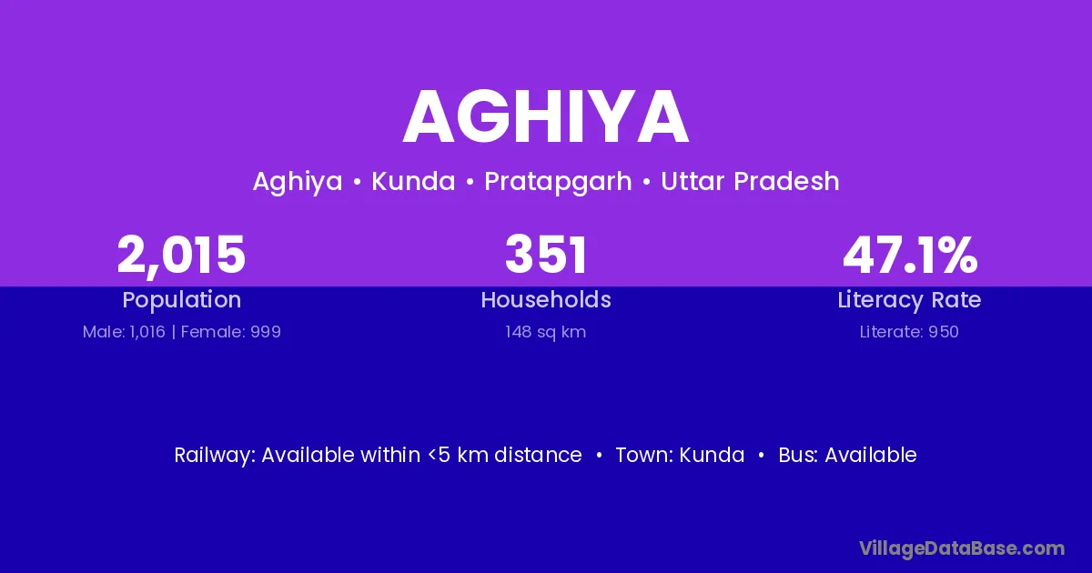 Aghiya village has a total population of 2,015 people, of which 1,016 are males and 999 are females.