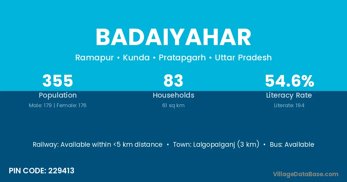 Lalgopalganj (3 km) is the nearest town to Badaiyahar village for major economic activities and is located approximately 3 km away.