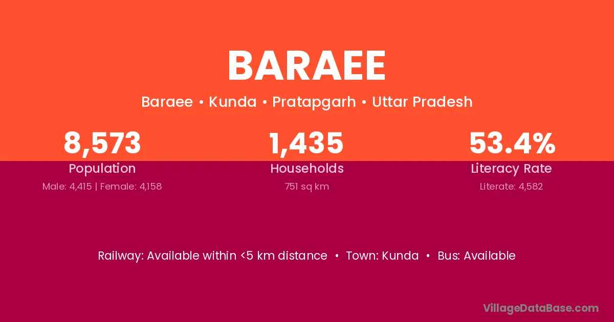 Baraee village has a total population of 8,573 people, of which 4,415 are males and 4,158 are females.
