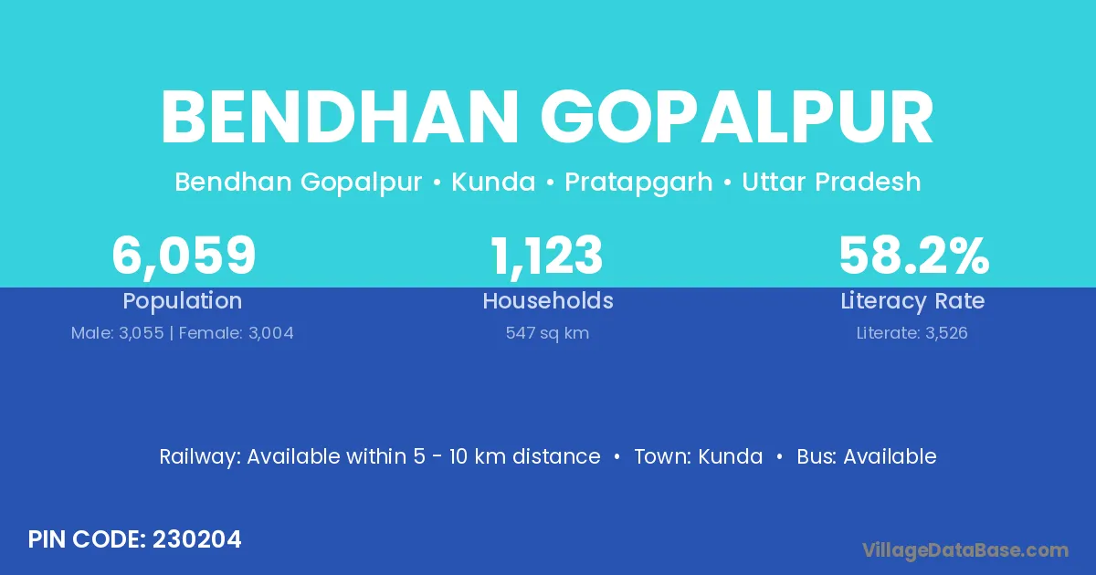 Bendhan Gopalpur village has a total population of 6,059 people, of which 3,055 are males and 3,004 are females.