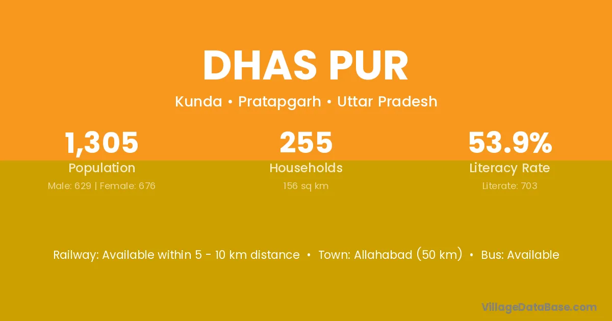 Allahabad (50 km) is the nearest town to Dhas Pur village for major economic activities and is located approximately 50 km away.