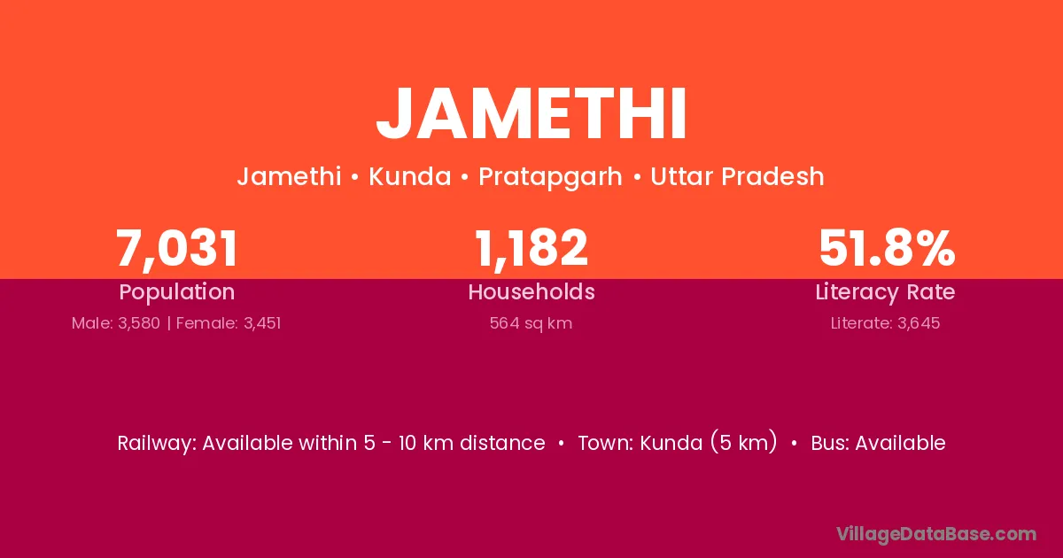 Jamethi village has a total population of 7,031 people, of which 3,580 are males and 3,451 are females.