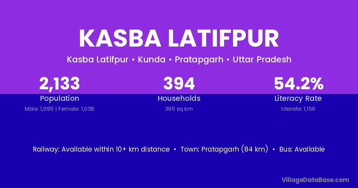 Pratapgarh (84 km) is the nearest town to Kasba Latifpur village for major economic activities and is located approximately 84 km away.