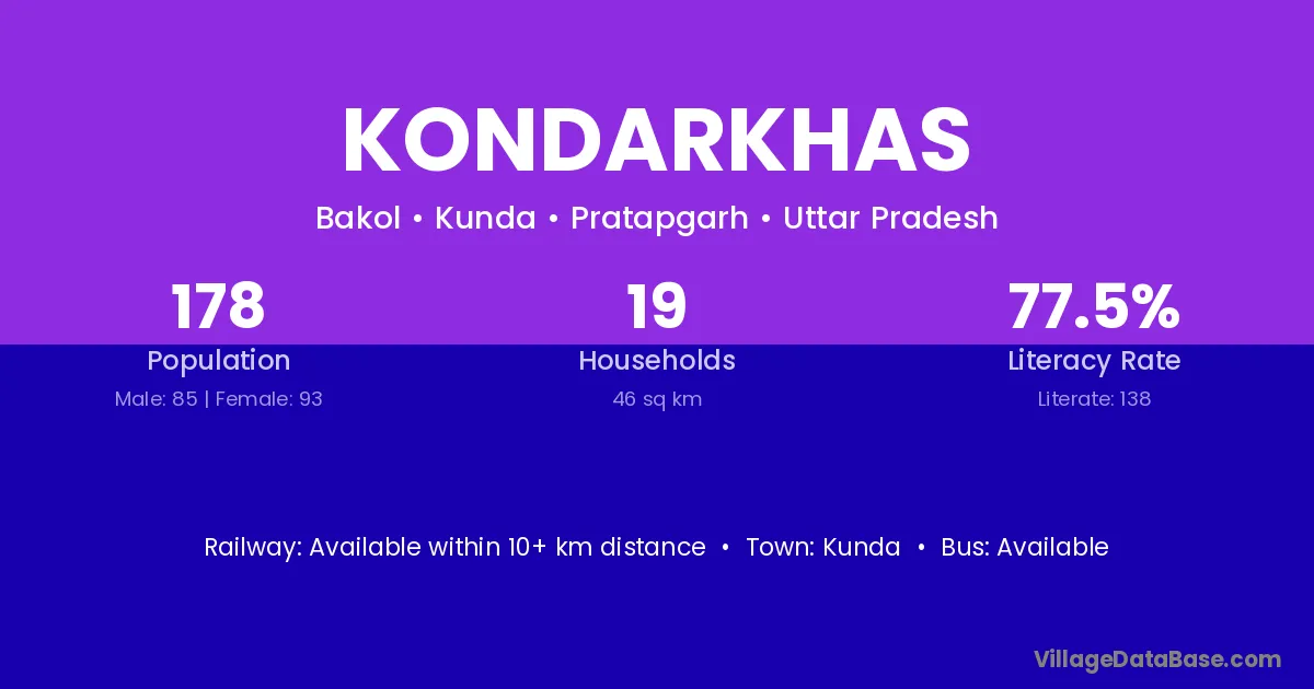 Kondarkhas village has a total population of 178 people, of which 85 are males and 93 are females.