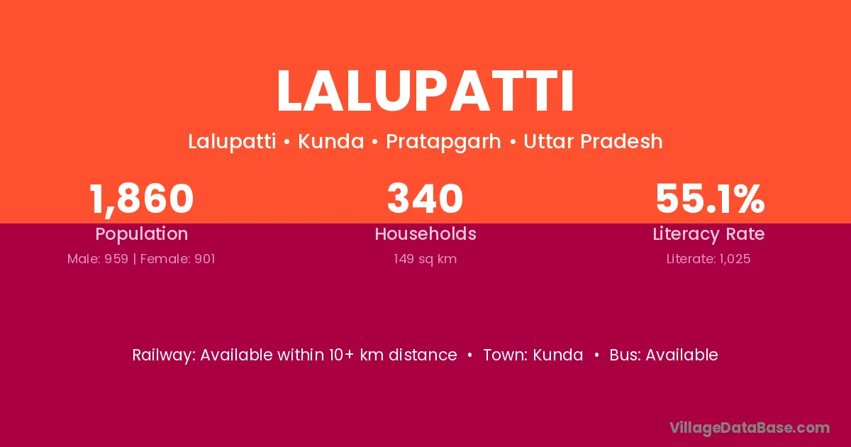 Lalupatti village has a total population of 1,860 people, of which 959 are males and 901 are females.