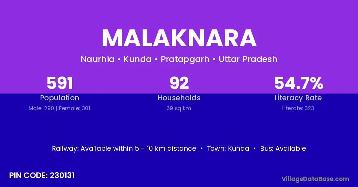 Malaknara village has a total population of 591 people, of which 290 are males and 301 are females.