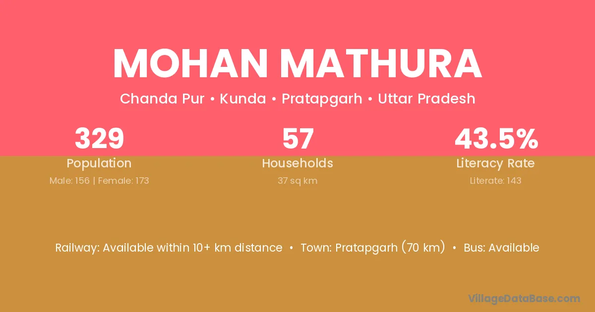 Pratapgarh (70 km) is the nearest town to Mohan Mathura village for major economic activities and is located approximately 70 km away.
