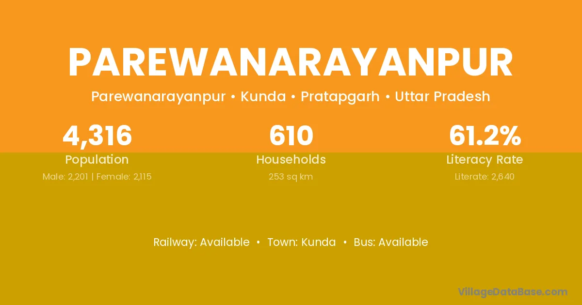 Parewanarayanpur village has a total population of 4,316 people, of which 2,201 are males and 2,115 are females.