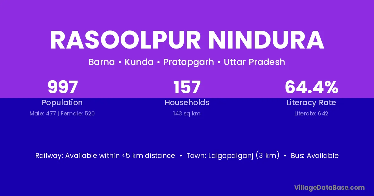 Lalgopalganj (3 km) is the nearest town to Rasoolpur Nindura village for major economic activities and is located approximately 3 km away.