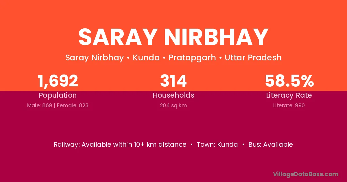 Saray Nirbhay village has a total population of 1,692 people, of which 869 are males and 823 are females.
