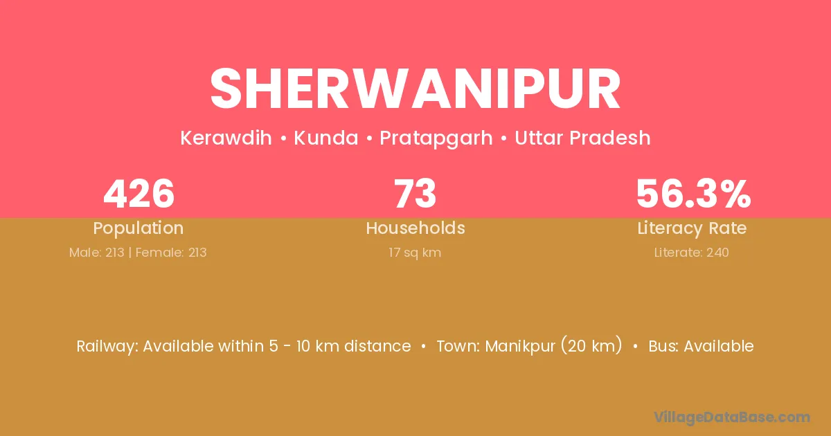 Sherwanipur village has a total population of 426 people, of which 213 are males and 213 are females.