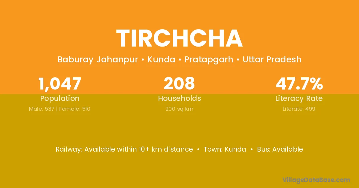 Tirchcha village has a total population of 1,047 people, of which 537 are males and 510 are females.
