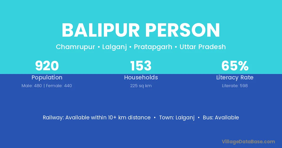 Balipur Person village has a total population of 920 people, of which 480 are males and 440 are females.