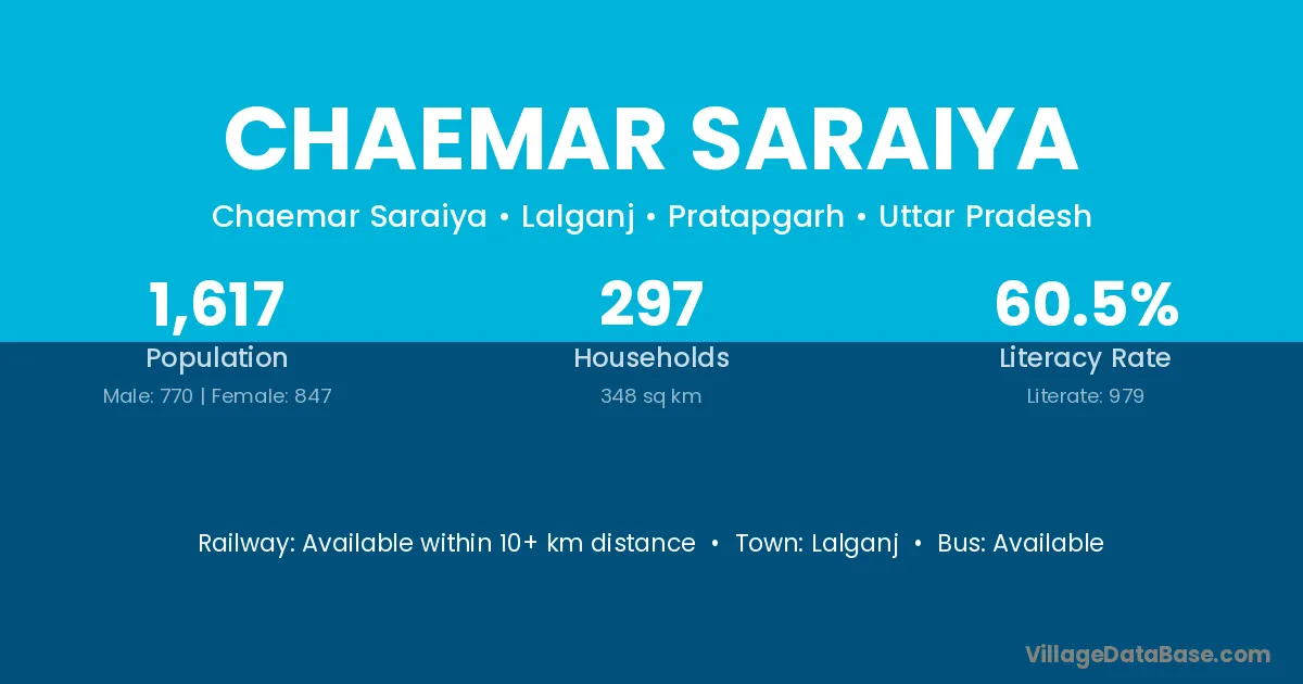 Chaemar Saraiya village has a total population of 1,617 people, of which 770 are males and 847 are females.