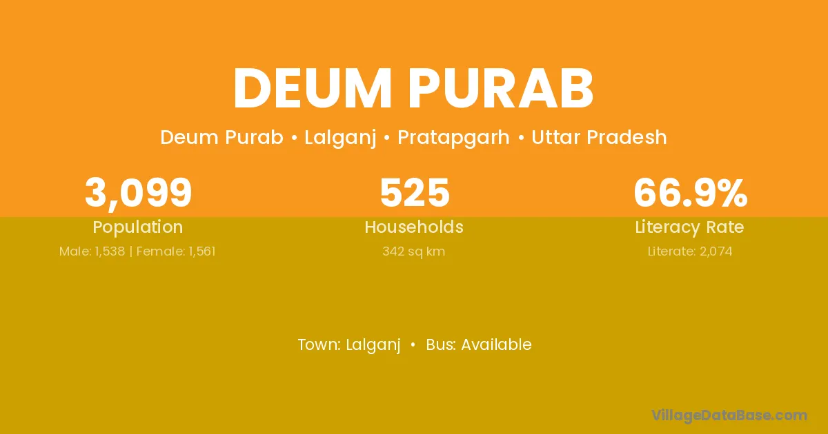 Deum Purab village has a total population of 3,099 people, of which 1,538 are males and 1,561 are females.