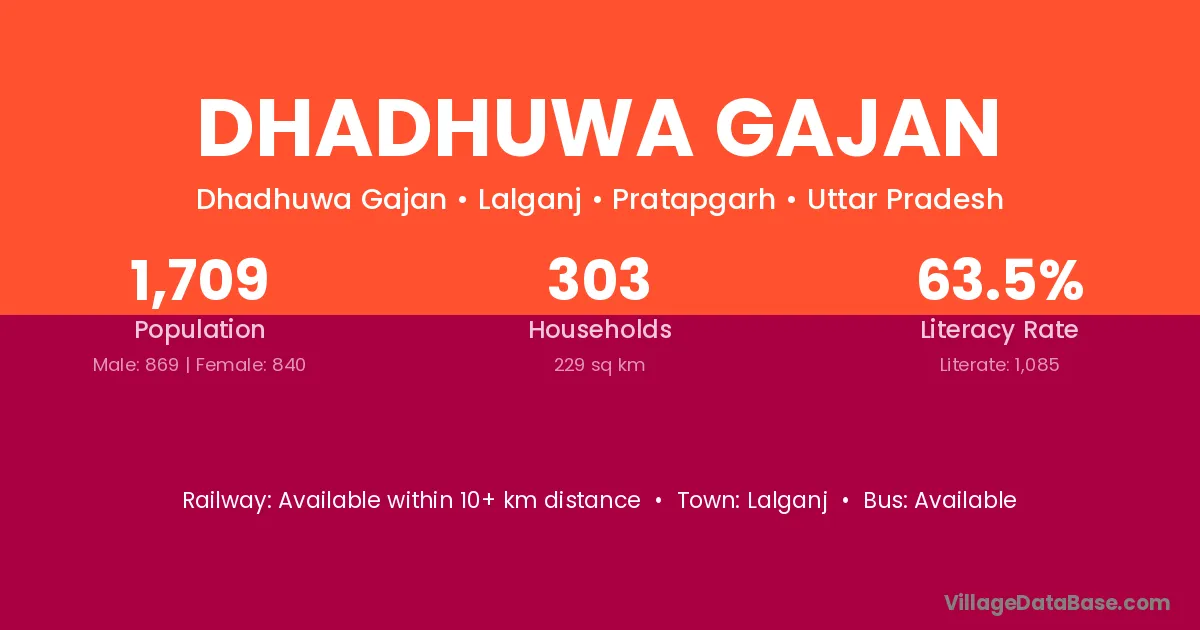 Dhadhuwa Gajan village has a total population of 1,709 people, of which 869 are males and 840 are females.
