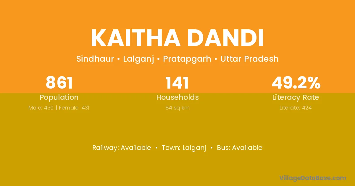 Kaitha Dandi village has a total population of 861 people, of which 430 are males and 431 are females.