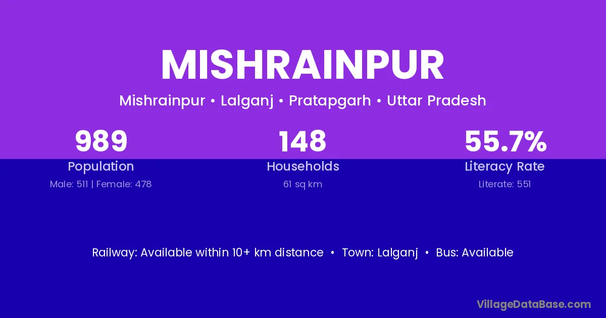 Mishrainpur village has a total population of 989 people, of which 511 are males and 478 are females.
