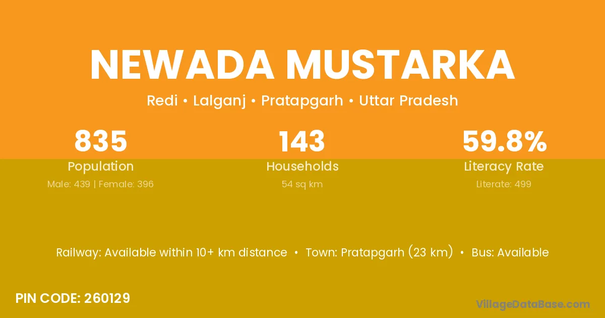 Pratapgarh (23 km) is the nearest town to Newada Mustarka village for major economic activities and is located approximately 23 km away.
