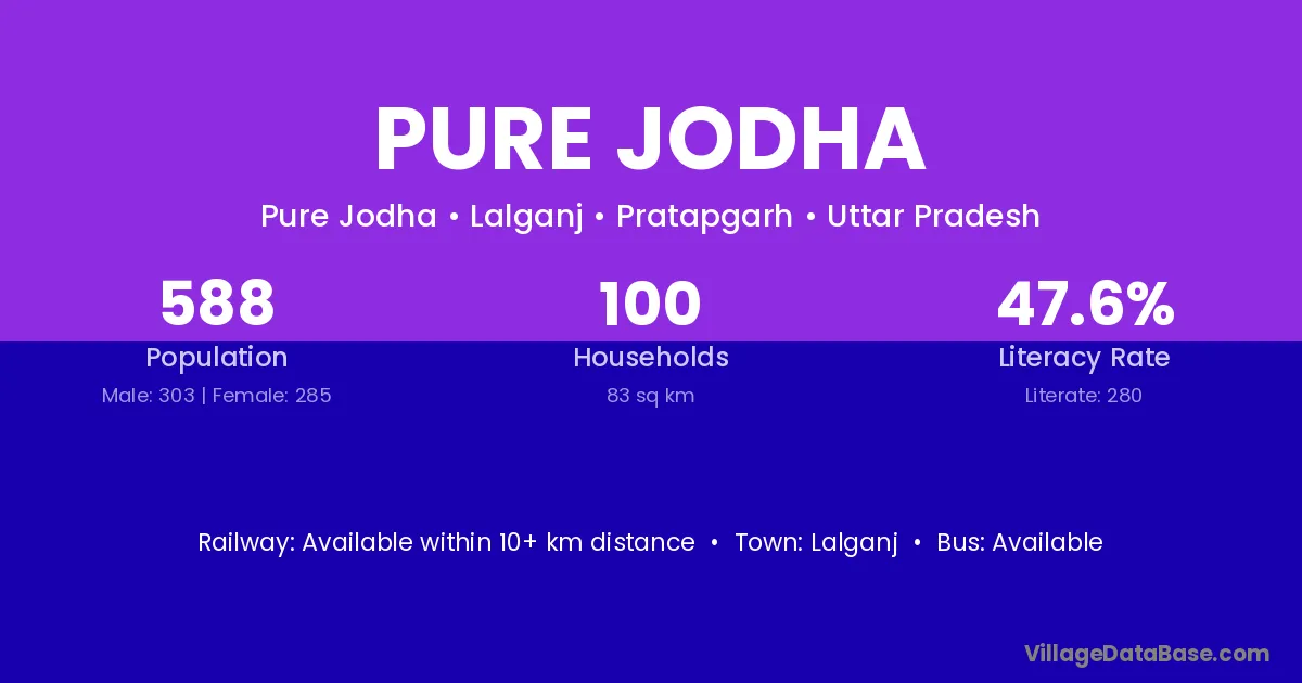 Pure Jodha village has a total population of 588 people, of which 303 are males and 285 are females.