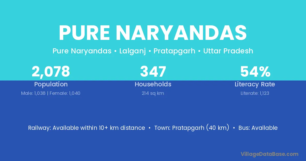 Pure Naryandas village has a total population of 2,078 people, of which 1,038 are males and 1,040 are females.