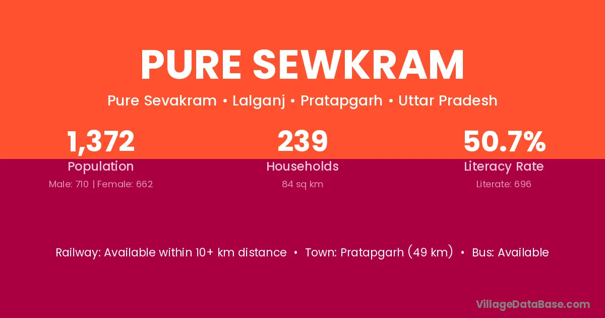 Pratapgarh (49 km) is the nearest town to Pure Sewkram village for major economic activities and is located approximately 49 km away.