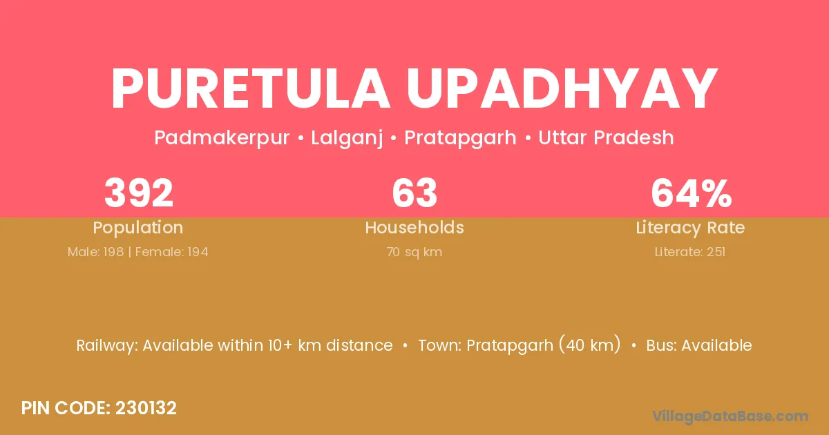 Pratapgarh (40 km) is the nearest town to Puretula Upadhyay village for major economic activities and is located approximately 40 km away.