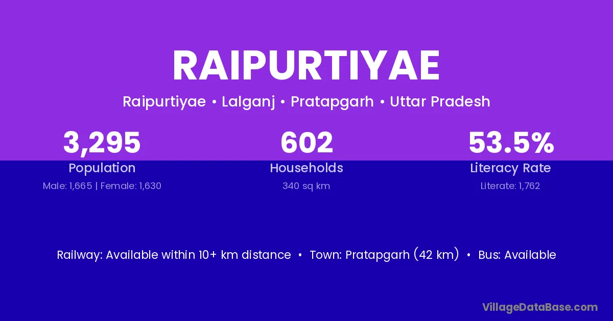 Pratapgarh (42 km) is the nearest town to Raipurtiyae village for major economic activities and is located approximately 42 km away.