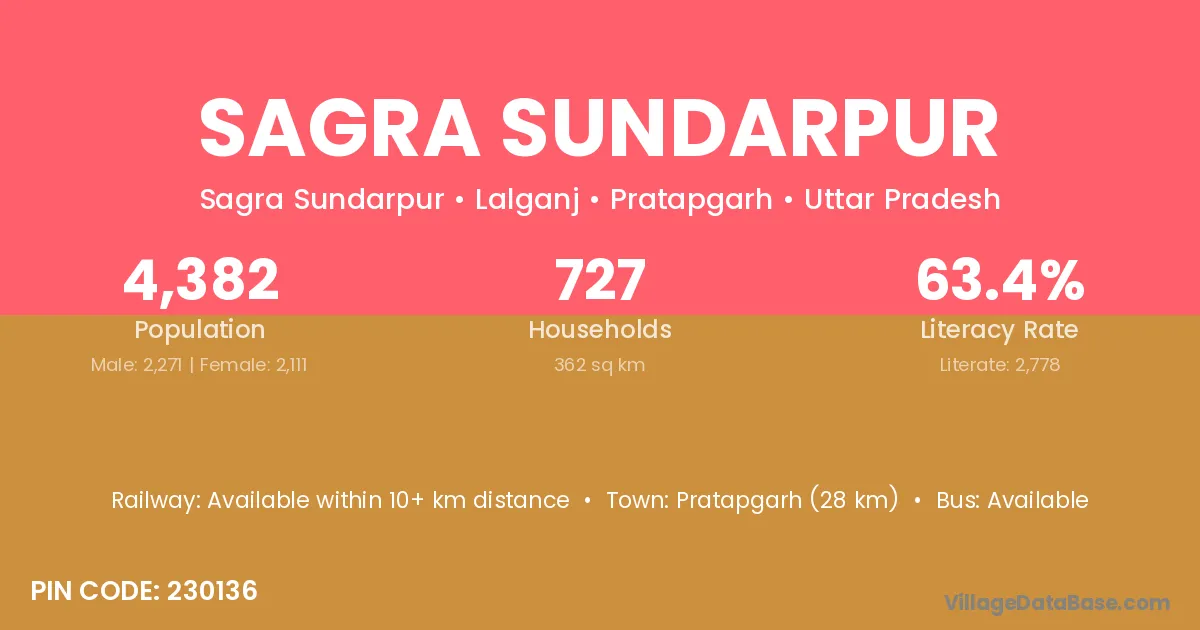 Pratapgarh (28 km) is the nearest town to Sagra Sundarpur village for major economic activities and is located approximately 28 km away.