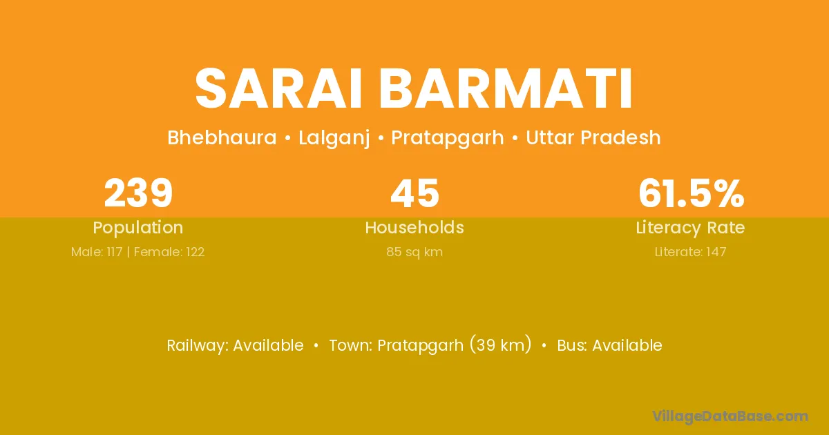 Pratapgarh (39 km) is the nearest town to Sarai Barmati village for major economic activities and is located approximately 39 km away.