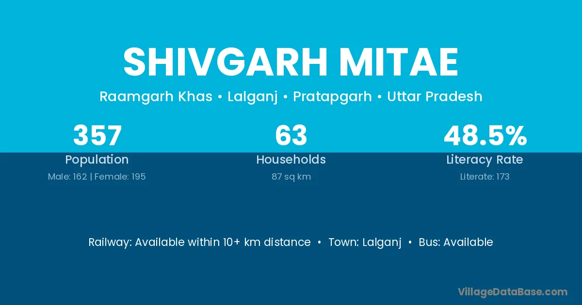 Shivgarh Mitae village has a total population of 357 people, of which 162 are males and 195 are females.
