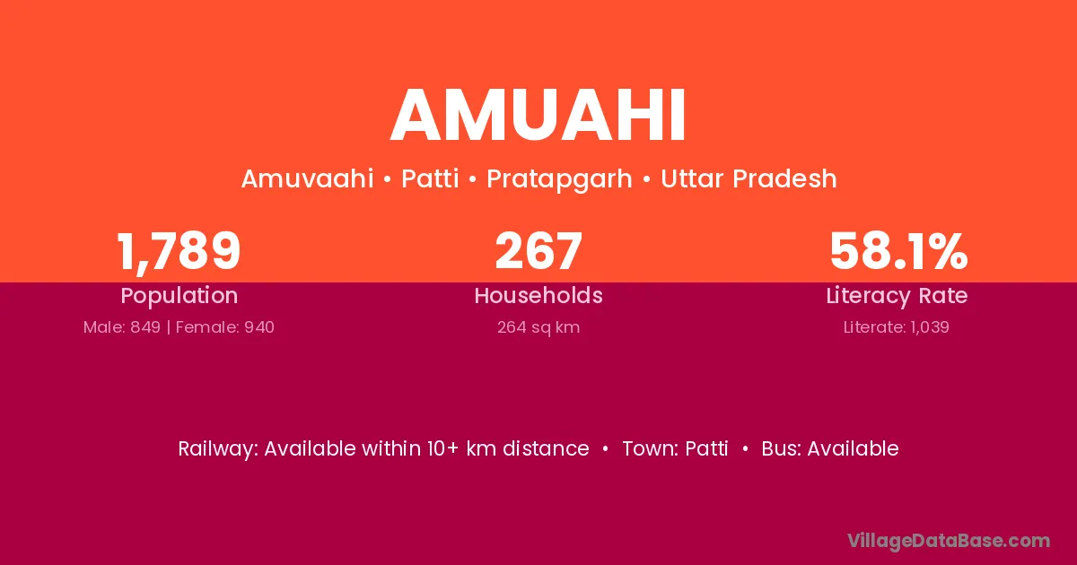 Amuahi village has a total population of 1,789 people, of which 849 are males and 940 are females.