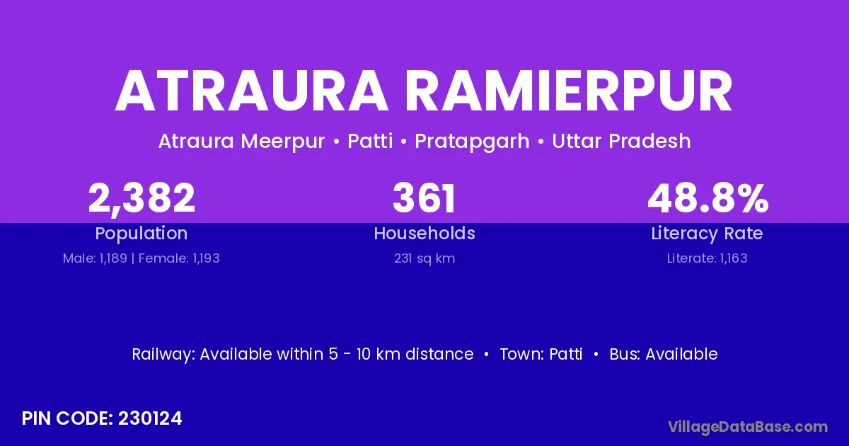 Atraura Ramierpur village has a total population of 2,382 people, of which 1,189 are males and 1,193 are females.
