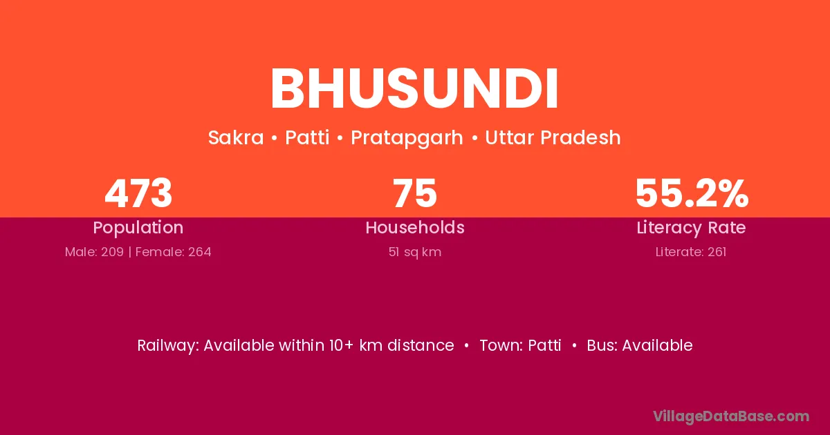 Bhusundi village has a total population of 473 people, of which 209 are males and 264 are females.