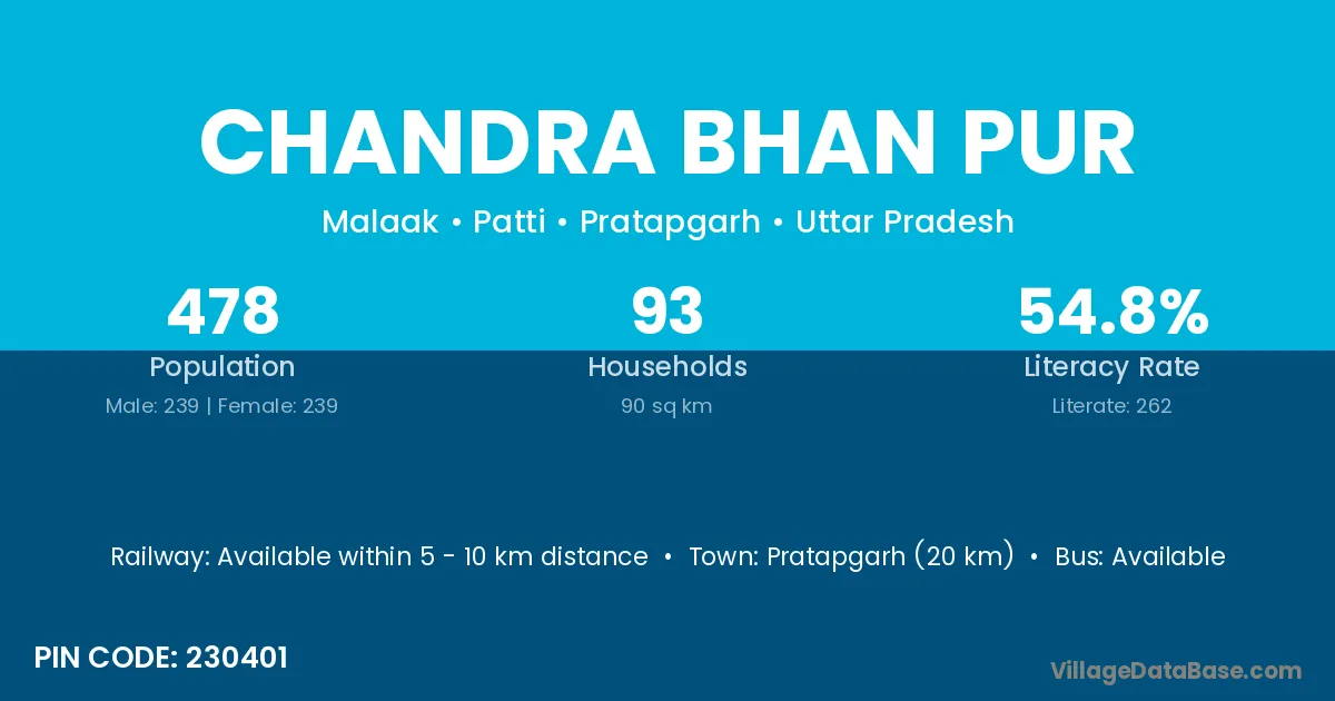 Pratapgarh (20 km) is the nearest town to Chandra Bhan Pur village for major economic activities and is located approximately 20 km away.