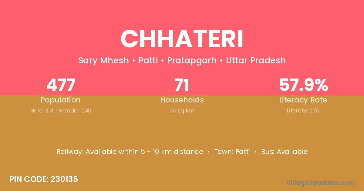 Chhateri village has a total population of 477 people, of which 231 are males and 246 are females.