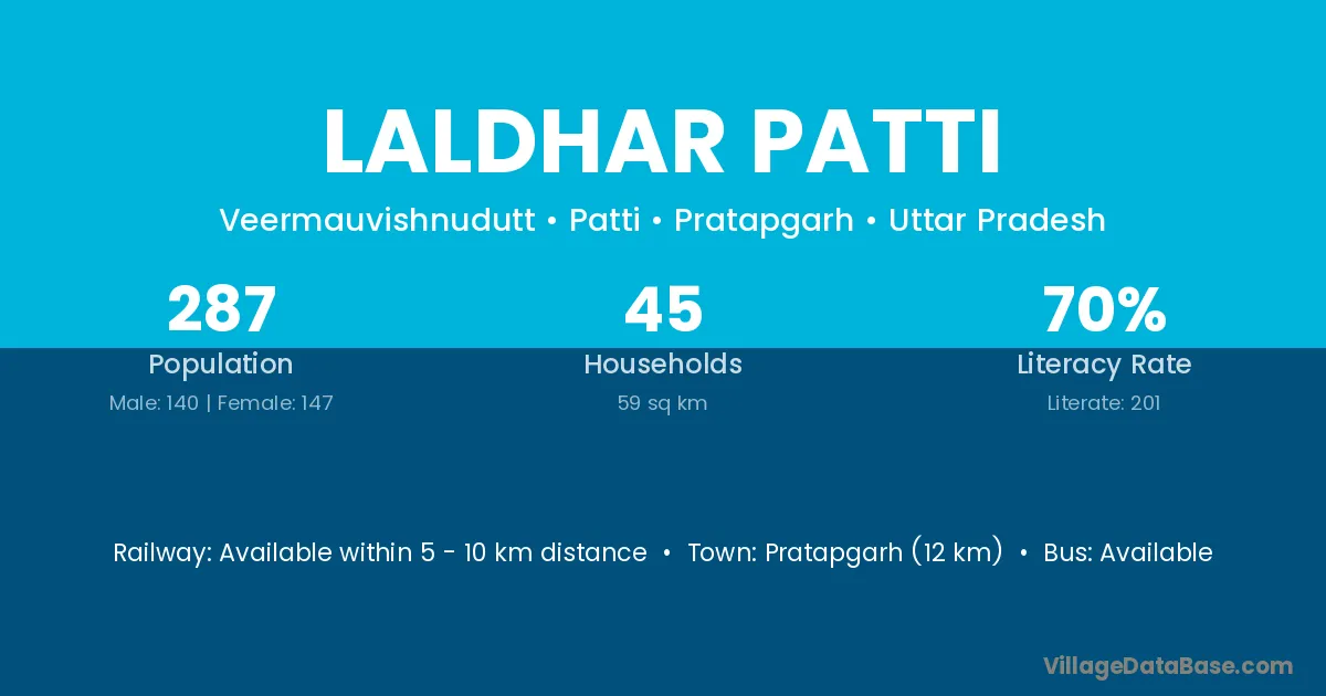Pratapgarh (12 km) is the nearest town to Laldhar Patti village for major economic activities and is located approximately 12 km away.