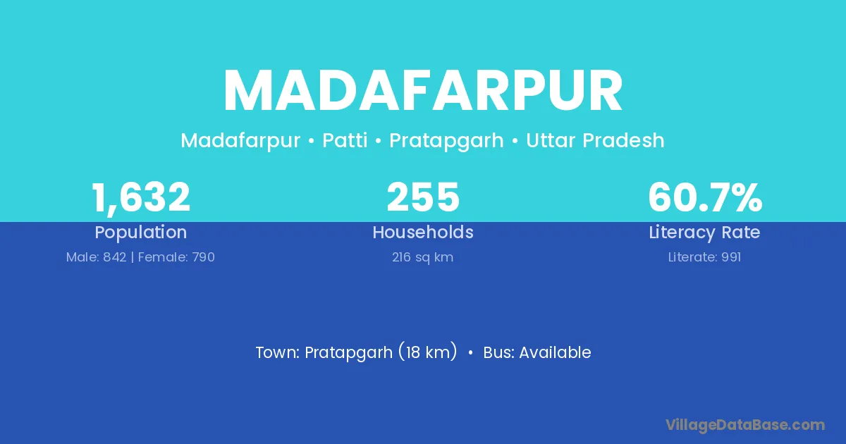 Pratapgarh (18 km) is the nearest town to Madafarpur village for major economic activities and is located approximately 18 km away.