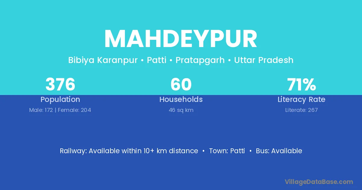 Mahdeypur village has a total population of 376 people, of which 172 are males and 204 are females.