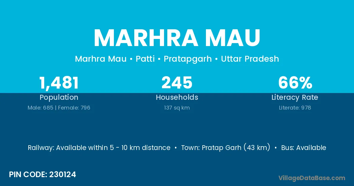 Pratap Garh (43 km) is the nearest town to Marhra Mau village for major economic activities and is located approximately 43 km away.
